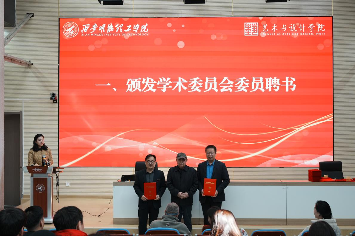会议伊始,大师工作室特聘教授柏雨果和艺术与设计学院院长苟秉宸分别为学术委员会委员颁发聘书,同时希望各位委员在学院学科建设、学术评价、学术发展和学风建设等学术事务中认真行使决策、审议、评定和咨询等职权。