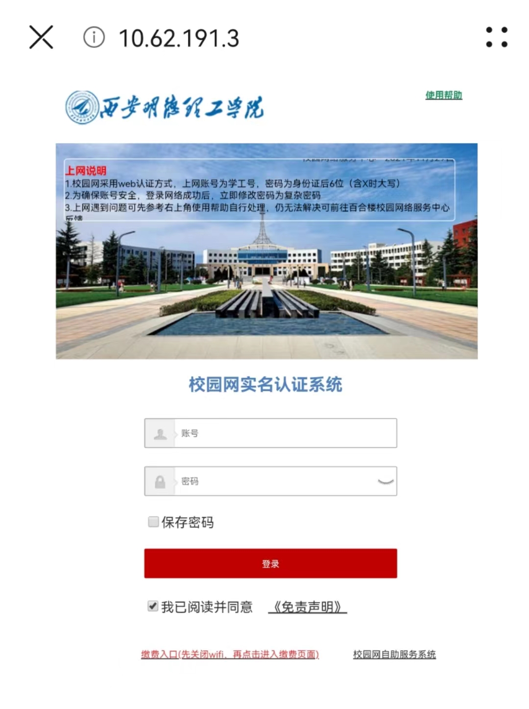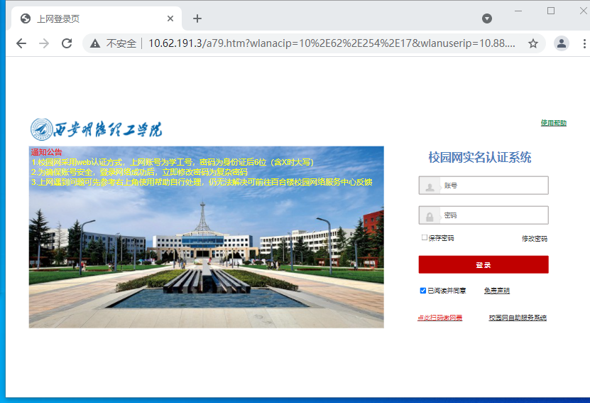 2.连接成功后会自动弹出认证界面(如果认证界面弹不出,请打开设备浏览器,在地址栏内手动输入10.62.191.3,打开认证界面;