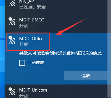 1.点开系统右下角无线图标,选择无线名称为MDIT-Office链接。