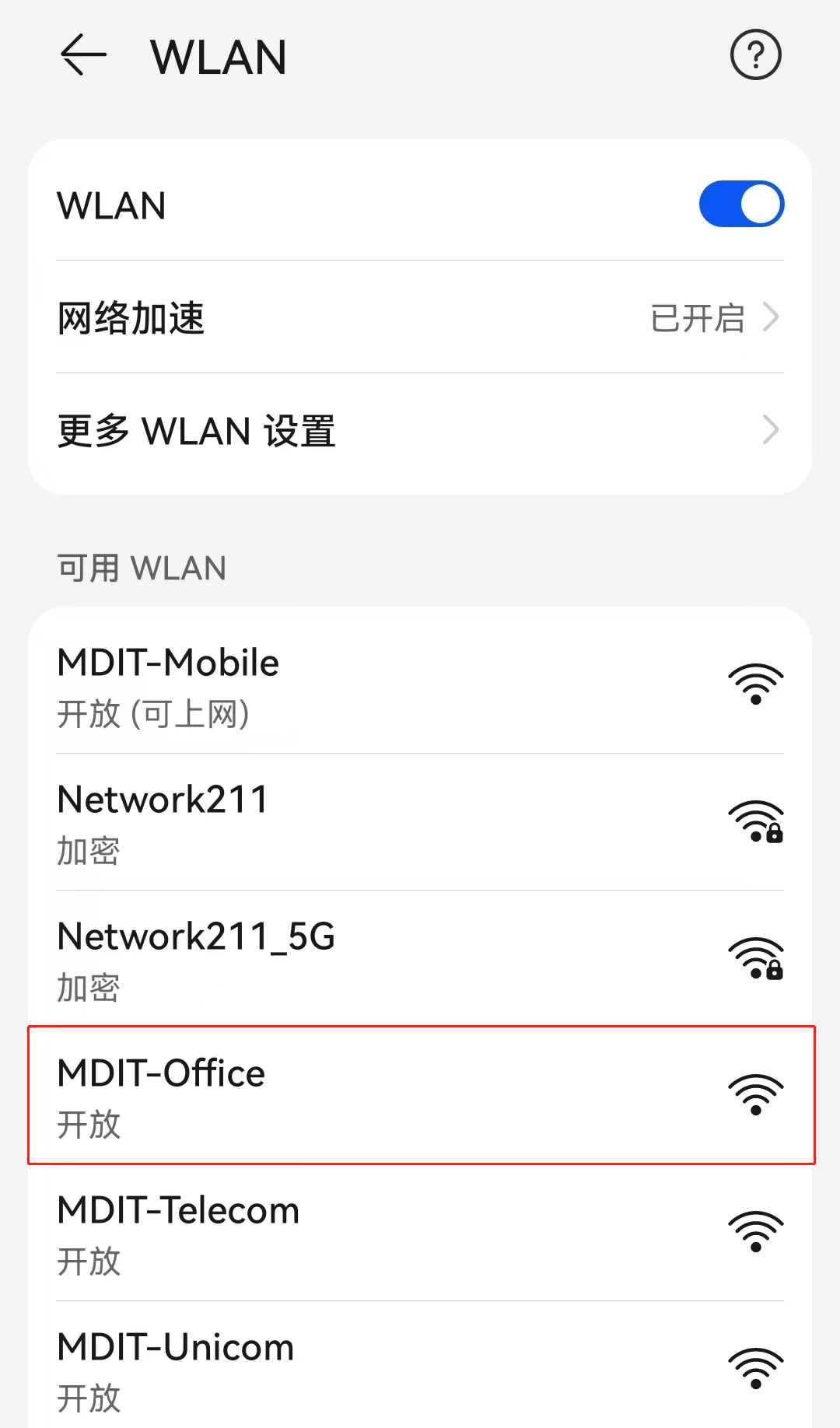 1.打开手机WiFi 开关,连接MDIT-Office;